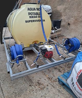 PRECIO NO NEGOCIABLE Motivo venta: no lo uso NO HAGO CAMBIOS HAY QUE VENIR A POR ELLA NO HAY QUE PAGAR IVA Medidas: 3m largo x 2m ancho Capacidad 3.000 litros. Montada en plataforma metálica; con válvula reductor de caudal; 2 carros metálicos para recoger manguera de riego; 1.000m lineales manguera; bomberos doble capa 38MM; alcance salida agua a los 100m de manguera; Bomba Honda WH20X Gasolina 27 M3/Hora hasta 45M de elevación; 3 salidas de agua conexión NO LEER: Riego , Jardin , Huerto , Piscina , Agricultura , Ramaderia , Tractor , Jardineria , Campo