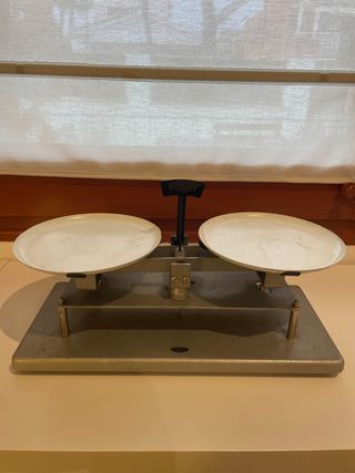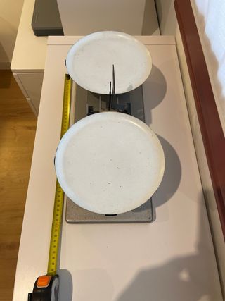 Balanza de precisión Enosa, ideal para mediciones exactas. - Hecha de metal. - 40 ancho, 18 fondo, 24 alto. en cms - Dos platillos para pesaje. - Base de madera pintada.