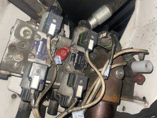 Componente de control hidráulico con varias válvulas. - Estructura metálica. - Conexiones eléctricas. - Mangueras de conexión.