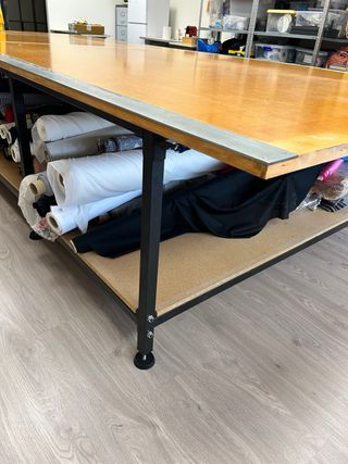 Mesa de trabajo de gran tamaño, ideal para talleres o espacios de costura. - Superficie de madera. - Estructura metálica resistente.