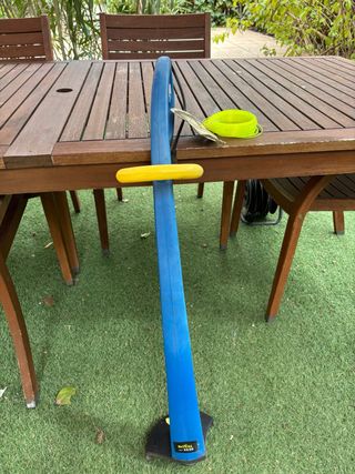 Kit completo para trabajos de nivelación y medición. Incluye un nivel láser, un trípode y accesorios. - Nivel láser amarillo y negro. - Trípode plateado con patas negras. - Accesorio azul. - Soporte amarillo para el láser.