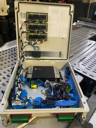 Cuadro eléctrico industrial con varios componentes. Estaba instalado en camion basurero. Escucho ofertas - Módulos de conexión. - Relés. - Cableado organizado.