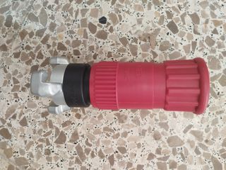 Lanza de manguera con conexión de 45mm. El cuerpo principal es de color rojo y tiene un diseño acanalado para un mejor agarre. - Conexión de 45mm. - Cuerpo principal de color rojo. - Parte superior metálica con palas. - Parte inferior metálica con rosca.