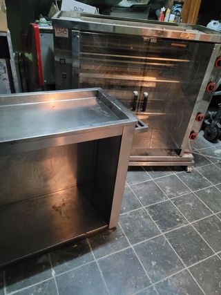 Equipo de cocina profesional para preparar pollos alast. De 8 espadas rotatorio - Fabricado todo en acero inoxidable. -mesa para cortar Pollos acero. -campana de humos de acero. -mesa acero con pica lo unico que le falta son dos espadas.