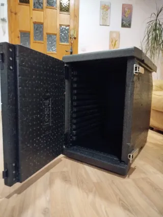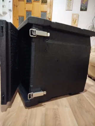 Dispongo de 4 contenedores (el precio que sale en el anuncio es por unidad) Contenedor isotérmico de color negro, de la marca thermo furure box ideal para mantener la temperatura de los alimentos o bebidas. - Material de poliestireno expandido. - Cierre con dos clips metálicos. - Tapa abatible. Medidas 64'5x44'5x62'5