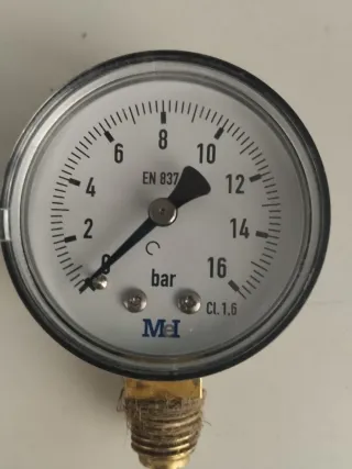 Manómetro de presión de 50mm con un rango de 0 a 16 BAR. Vertical de 1/4" - Diámetro de la esfera: 50mm. - Rango de medición: 0-16 BAR. - Conexión roscada. - Clase de precisión: CL.1,6.