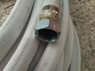 Manguera de 45mm enrollada, lista para su uso. - Conexiones metálicas. - Material textil resistente.