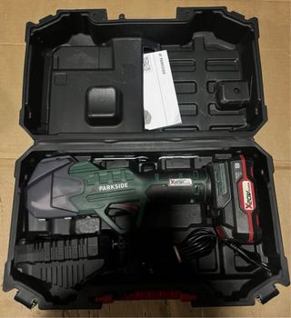 Tijera de podar eléctrica Parkside, ideal para trabajos en el jardín. Se presenta en su maletín original. - Incluye tijera de podar. - Batería X20V TEAM. - Cargador. - Maletín de transporte. incluye bateria de 2 ah y cargador de 2,4 ah 20v