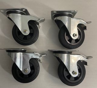 Juego de cuatro ruedas giratorias de la marca Blickle, cada una con freno. - Fabricadas en metal y goma. - Placa de montaje metálica. - Diseño giratorio.