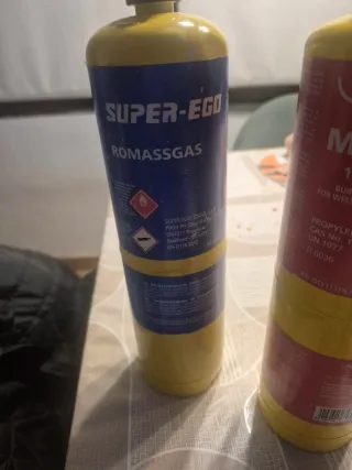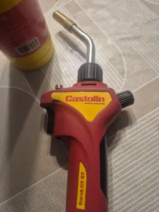 Soplete de la marca Castolin, modelo CT 27. Y dos bombonas - Mango ergonómico en color rojo. - Boquilla metálica curva. - Incluye un pequeño depósito amarillo.