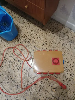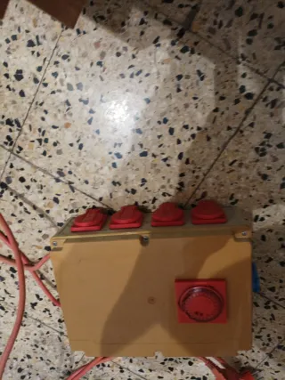Cuadro eléctrico para cultivo. Incluye cable de alimentación. - Caja de plástico color beige. - Conexiones rojas. - Etiqueta circular roja con espiral negra.