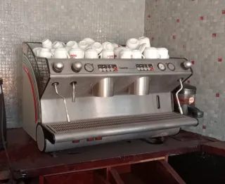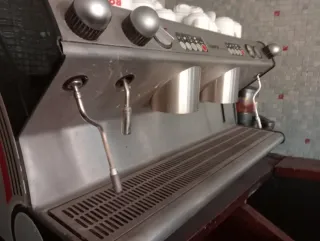 Se vende máquina de café profesional de doble grupo. Ideal para negocios de hostelería. - Diseño robusto y duradero. - Acabado metálico plateado con detalles rojos. - Bandeja de goteo extraíble.