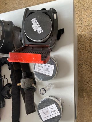 Equipo completo de respiración autónoma válido para rebarbado o desbrozado , con filtros de repuesto y los 2 sistemas de aire (motor ventilador o regulador para maquera , ver fotos casi no se ha usado se entrega completo ver fotos es la mejor descripción, precio no negociable