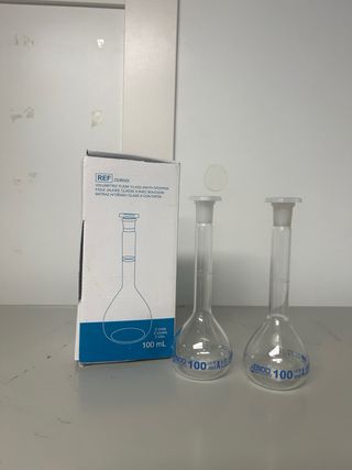 Matraz aforado de cristal con tapon (clase A, transparente, 100 ml de capacidad, NS 14/23 en el cuello, 2 unidades)