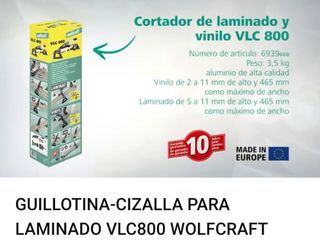 Cortador profesional de laminado y vinilo marca Wolfcraft, modelo VLC 800. Fabricado en aluminio de alta calidad. - Ideal para vinilo de 2 a 11 mm de alto y 465 mm de ancho. - Apto para laminado de 5 a 11 mm de alto y 465 mm de ancho. - Incluye garantía de 10 años. - Fabricado en Europa.