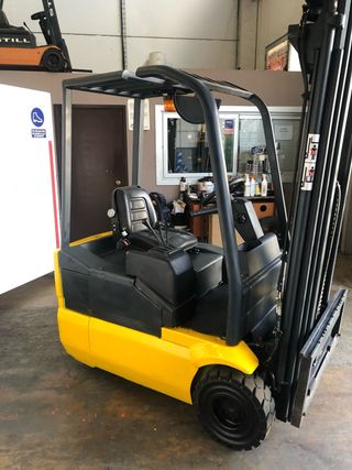 Carretilla elevadora en color amarillo y negro. - Asiento del conductor. - Mástil de elevación. - Ruedas seminuevas,elevación a 5100,baterías al 55% de capacidad, máquina, completamente repasada, el Iva y el transporte no está incluido en el precio