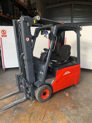 Carretilla elevadora de la marca Linde en color rojo. - Diseño robusto. - Ruedas resistentes. - Asiento cómodo. Mástil triples a 6200 de elevación, batería testa al 85 %, Ruedas seminuevas, IVA y transporte no incluidos