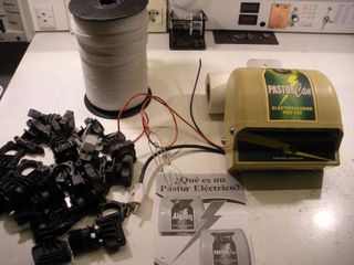 Electrificador de la marca Alazán, modelo Pastor Eléctrico RED 220. - Incluye el manual ¿Qué es un Pastor Eléctrico?. - Se aprecian 15 aisladores de plástico negro. - Se incluye un rollo de cinta para cercado. - Cables de conexión con pinza.