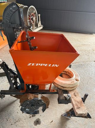 Sembradora de patatas de la marca Zeppelin. - Tolva de color naranja. - Mecanismo de cadena. - Soporte para botella.