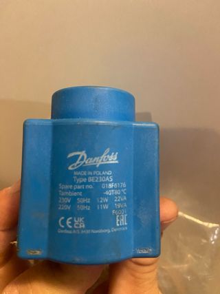 Válvula solenoide Danfoss. - Modelo: BE230AS - Fabricada en Polonia - Número de repuesto: 018F6176 - Rango de temperatura ambiente: -40T80 °C - Consumo: 12W (230V, 50Hz) / 11W (220V, 50Hz) - Potencia aparente: 22VA (230V, 50Hz) / 19VA (220V, 50Hz) - Certificaciones: CE, UKCA, EAC - Dirección del fabricante: Danfoss A/S, 6430 Nordborg, Denmark esta sucia pero es nueva