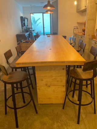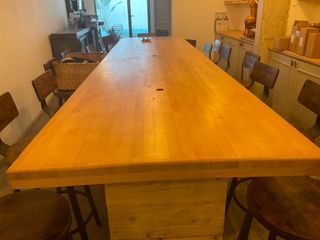 Mesa de taller de gran tamaño, ideal para espacios amplios. Hay que venir a Calle Major 15 Sitges para desmontar y tomar. - Superficie de madera clara. - Base de madera con listones.