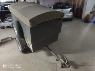 Remolque de carga para coche con lona. Medidas del cajon: 98cm de ancho, 1'33 largo, 1'03 alto. - Color gris oscuro. - Lona de color beige. - Rueda de repuesto incluida.