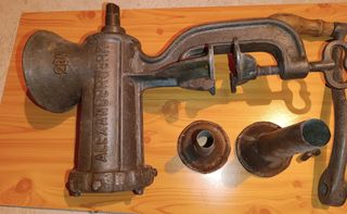 Antigua máquina de embutir y picar carne, con todos sus accesorios.
