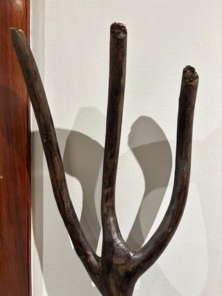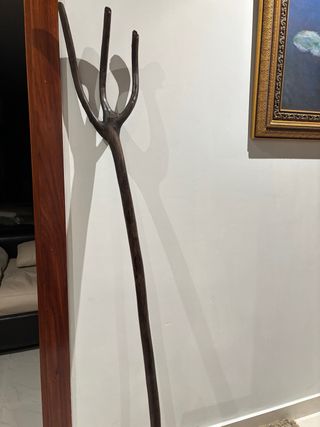 Trillo de madera con un diseño rústico y natural. - Fabricado en madera oscura. - Tres púas en la parte superior. - Mango largo y estilizado.