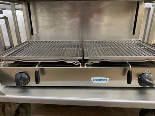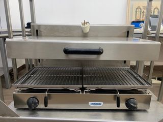 Fabricante: TECNOINOX Largo: 900 mm Ancho: 560 mm Alto: 690 mm Peso: 75 Kg Potencia Eléctrica: 6kw DESCRIPCIÓN COMENTARIOS SALAMANDRA DE TECHO MOVIL, SE-80 Construcción en acero inoxidable. Cubierta móvil superior con conducto de extracción de humos. Resistencias Incoloy de 6.5 mm de diametro (3 x 2 kW). Dos zonas independientes de calentamiento con control de temperaturas separado. Bandeja recogegrasas incorporada. Puede fijarse a la pared mediante accesorio opcional. Zona de cocción: 800 x 350 mm. Potencia: 6 kW. Dimensiones: 800 x 450 x 500 mm.