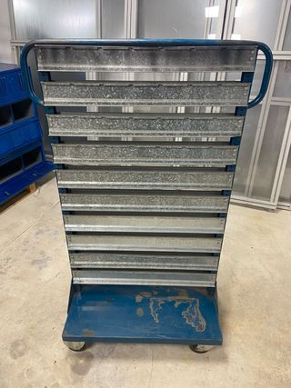 Carro de almacenamiento metálico con múltiples niveles, ideal para organizar tornillos, herramientas pequeñas u otros artículos. - Estructura de metal resistente. - Ruedas para fácil movilidad. - Diseño de niveles escalonados.