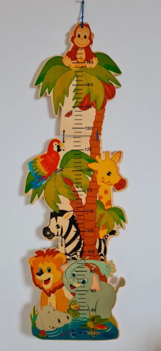 Original medidor de altura para niños con temática de la jungla. - Fabricado en madera. - Diseño con animales de la selva como un mono, loro, jirafa, cebra, león, elefante, hipopótamo, serpiente y cocodrilo. - Decoración colorida y divertida. - plegable - adecuado para una estatura de 80 a 150 cm aprox. - adecuado para edades de 1 - 12 años