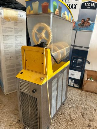 Máquina de granizado con un diseño llamativo en color amarillo y detalles plateados. Ideal para preparar bebidas frías. - Depósito transparente. - Tambor giratorio. - Base con rejilla de ventilación.