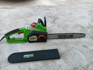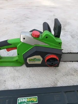 Motosierra eléctrica Florabest FKS 2200B1 en color verde y negro. - pala de 38 cm. - Mango ergonómico para un agarre cómodo. - Protector de cadena integrado. - Sistema de tensión de cadena rápido.