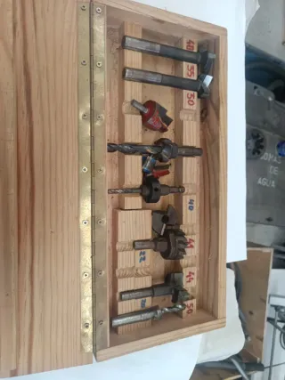 Set de fresas para trabajos de carpintería en madera. Incluye diferentes tamaños y tipos de fresas. - Caja de madera para almacenamiento.