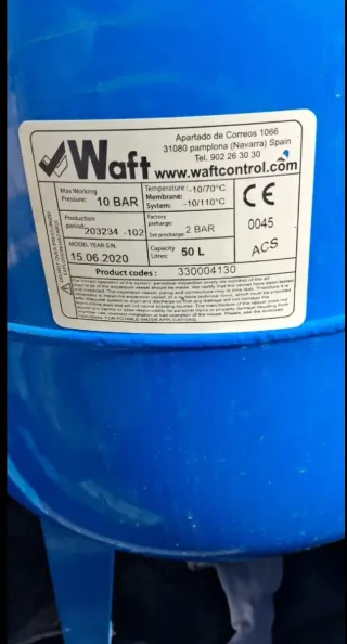 Vendo vaso de expansión de agua de la marca Waft, en buen estado. - Capacidad: 50 litros. - Presión máxima de trabajo: 10 bares. - Código de producto: 330004130. - Fabricado el 15/06/2020.
