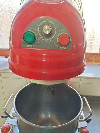 Batidora amasadora industrial de color rojo y acero inoxidable. Ideal para uso profesional. - Tiene un diseño robusto y resistente. - Incluye un tazón de acero inoxidable. - Dispone de controles de inicio y paro.