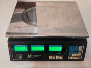 Báscula digital con capacidad de 40kg. Ideal para mercados o comercios. Solo abierta para comprobar su funcionamiento. Fue una devolución. Y Funciona a la perfección. - Pantalla LCD para peso, precio unitario y precio total. - Teclado numérico para memorizar precios. - Bateria autonomía 8 horas. - Bandeja de aluminio.