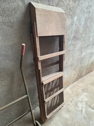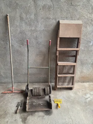 Conjunto de herramientas para la recolección y manejo de aceitunas. - Rastrillo grande de hierro. - Rastrillo pequeño de metal. - Rastrillo amarillo de plástico. - Carro recogedor con ruedas de hierro. - Zarandeador o cribador de madera plegable.