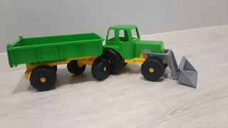 Juguete de tractor de plástico verde con remolque y pala frontal. - Remolque de carga de color verde. - Pala frontal de color gris. - Ruedas negras con detalles amarillos. - está sin estrenar, nuevo