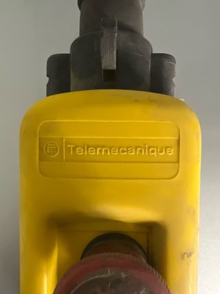Mando de polipasto de la marca Telemekanic en color amarillo. - Botón de parada de emergencia rojo. - Botón blanco con flecha hacia arriba. - Botón negro con flecha hacia abajo. - Conector superior negro.
