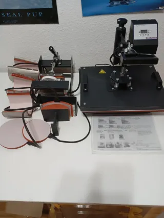 Prensa de calor multifuncional para sublimación. Contiene 8 elementos. Sublimacion en diferentes superficies: camisetas, llaveros, cualquier superficie lisa, tazas rectas, tazas cónicas, gorras, platos... Muy poco uso. - 1 Plancha lisa 39 x 30 cm. Control con pantalla digital: temporizador con alarma sonora, temperatura de 93 a 230 grados un programas de memoria. - 1 Plancha para tazas con 2 Abrazaderas de 11 Oz y 9 Oz. - 2 Abrazaderas para tazas cónicas de 12 y 17 Oz - 2 resistencias circulares para sublimacion en Platos - 1 estructura de sublimación de Gorras, con anclaje a la Plancha lisa