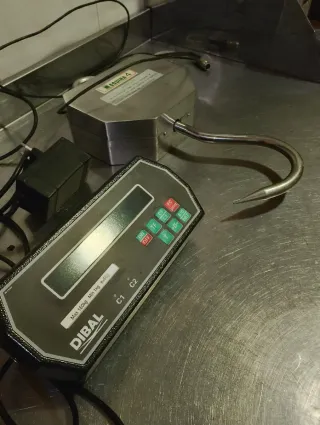 Báscula electrónica DIBAL con plato y gancho, capaz de pesar hasta 150 kg. - Plato de acero inoxidable. - Pantalla digital. - Incluye fuente de alimentación.
