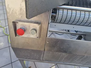 Máquina profesional para cortar carne. - Construcción robusta en acero inoxidable. - Panel de control con botón de parada de emergencia rojo y botón de encendido/apagado blanco.