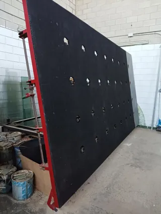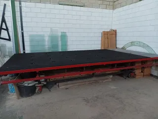 Mesa de corte profesional para cristal. Ideal para talleres y cristalerías. Elevación hidráulica de la mesa. - Elevación manual de las planchas de vidrio con sistema de bolas. - Superficie de corte amplia 480x250 cm. - Estructura robusta y estable. - Ruedas para fácil movilidad.