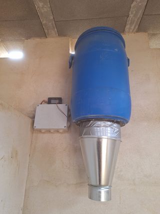 Sistema de dispensador de comida para caballos. - Bidón azul de plástico. - Incluye embudo metálico. - Caja de control con pantalla. - Bebedero metálico hexagonal.