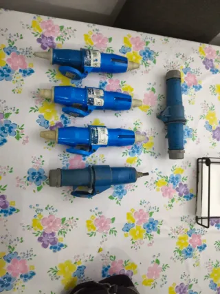 Conjunto de enchufes trifásicos, uno macho y otro hembra, en color azul. - Fabricados en material resistente. - Diseño industrial.
