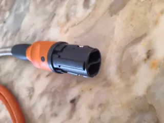 Cable de conexión de color naranja con dos extremos. - Un extremo tiene un conector negro. - El otro extremo tiene un conector naranja y negro con una sección metálica flexible.