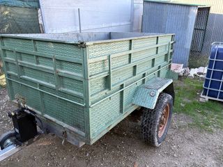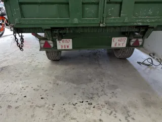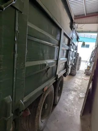 Remolque agrícola de color verde, ideal para trabajos en el campo. - Estructura robusta. - Ruedas nuevas, portera semiatomatica como las bañeras, y apertura de libro, deposito de agua, cajon de herramientas, compuerta para partir la carga, ejes fad, freno con zapatas nuevas, itv al dia,