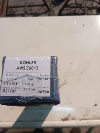 Paquete de electrodos de soldadura BÖHLER. - Modelo: AWS E6013 - Diámetro x Longitud: 3.2 x 300 mm - Cantidad: 168 unidades - Peso: 5,0 kg - Número de lote: B27787 - Número de artículo: 46766