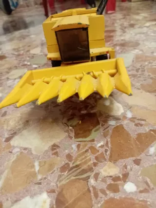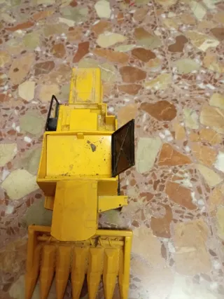 Este es un tractor de juguete de color amarillo brillante, con un diseño que recuerda a una cosechadora. - Cabezal de corte con múltiples púas. - Cabina con ventanas. - Ruedas visibles.
